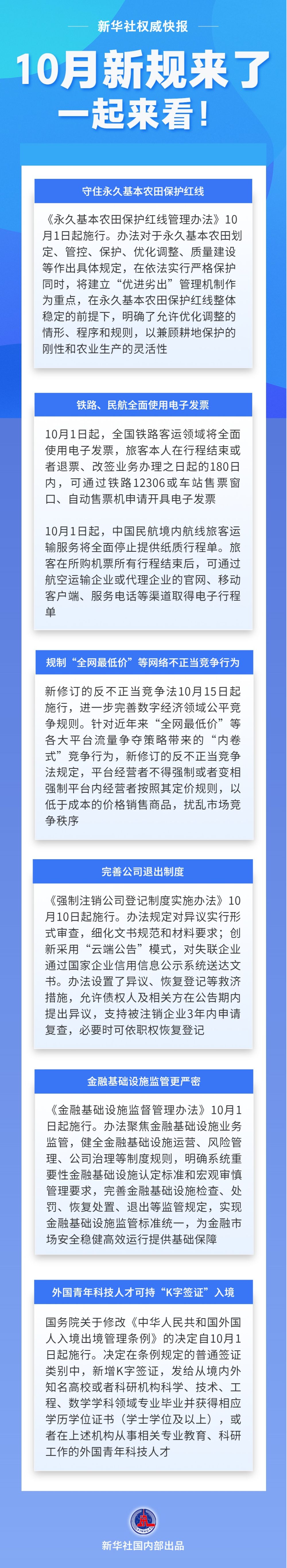 新办法守住永久基本农田保护红线;铁路、民航10月1日起全面使用电子发票;新修订的反不正当竞争法规制“全网最低价”等网络不正当竞争行为……10月新规来了正规股票配资官网网址,一起来看!